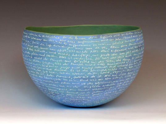 Porzellan, engobiert, poliert und beschriftet, Durchmesser 30 cm